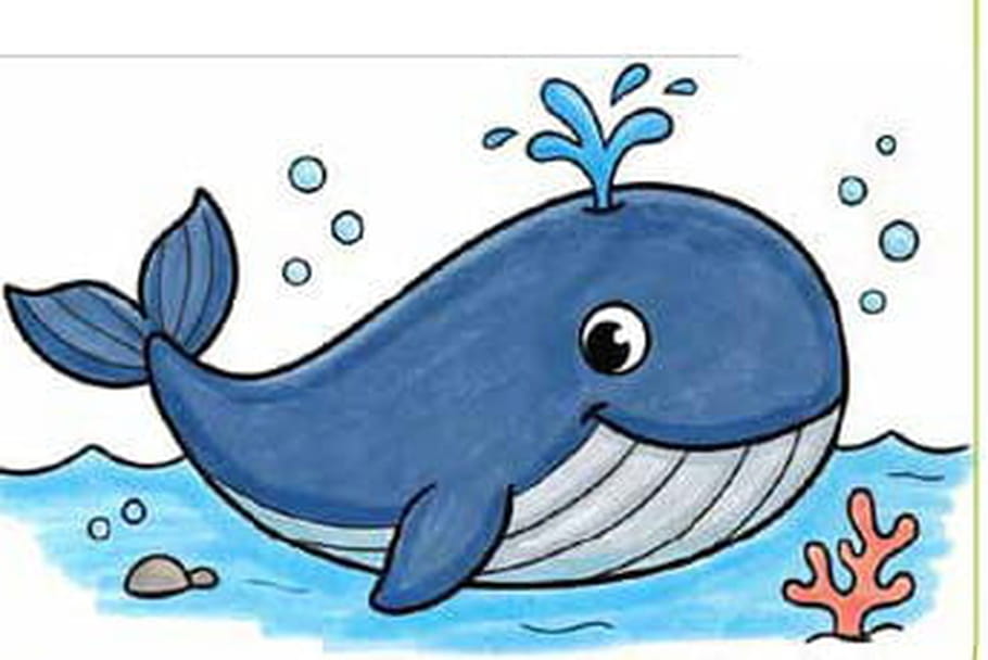- Étape 6 : C'est le moment de laisser parler ta créativité ! Tu peux colorier ta baleine avec de belles nuances de bleu et lui dessiner un décor marin avec des vagues, des petites bulles et même du corail. À tes feutres !