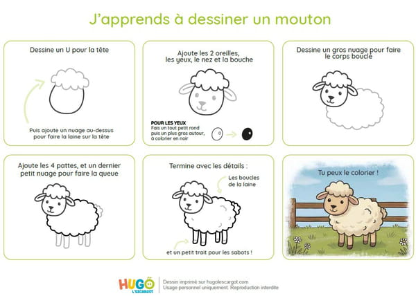 Pour commencer, trace un grand "U" qui formera le bas du visage, puis surmonte-le d'un petit nuage pour représenter la touffe de laine sur sa tête. Ensuite, donne-lui vie en ajoutant deux oreilles tombantes de chaque côté, un petit museau souriant et des yeux (la petite astuce : laisse un tout petit rond blanc à l'intérieur d'un rond noir plus grand pour le regard). Poursuis en traçant un gros nuage moelleux collé à sa tête pour créer son corps bien fourni. Il ne te reste plus qu'à lui dessiner quatre pattes en dessous et un minuscule nuage à l'arrière en guise de queue. Enfin, peaufine ton œuvre en ajoutant quelques petites boucles à l'intérieur de son pelage et un trait horizontal sur chaque patte pour marquer les sabots, avant de sortir tes crayons pour le colorier en train de brouter dans son pré !