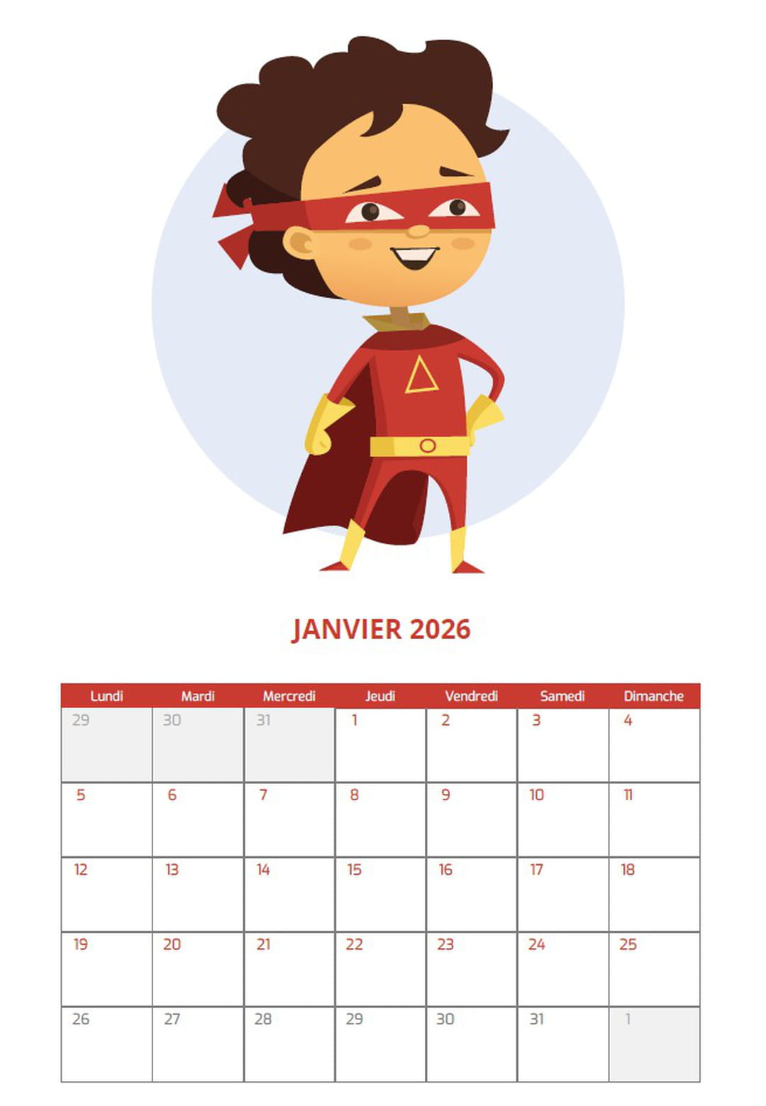 L'année 2026 devrait être riche en aventures grâce aux superhéros et justiciers qui posent fièrement sur ce calendrier. Avec une case par jour, les enfants pourront noter les jours importants qu'ils ne devront pas oublier. Pour imprimer ce calendrier 2026 " Super-héros ", téléchargez le PDF et imprimez la page qui correspond au mois en cours.