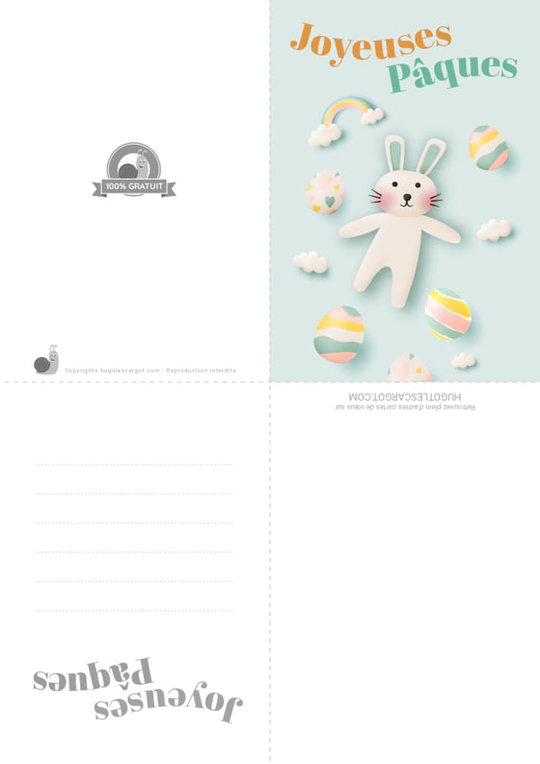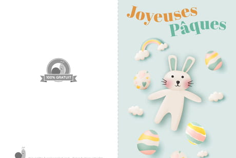 Carte Joyeuses Pâques avec un lapin, des œufs et des nuages