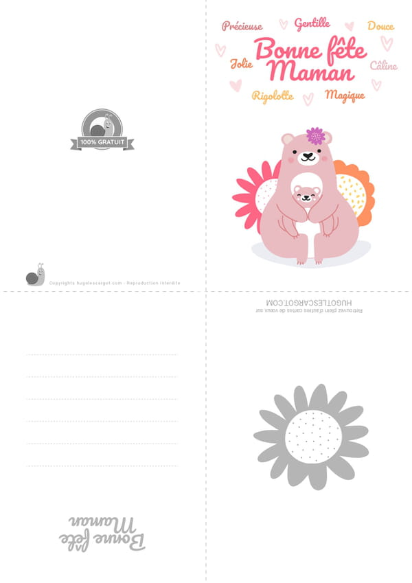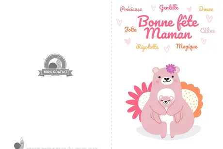 Cette carte sera parfaite pour souhaiter une bonne fête à ta maman. C'est aussi l'occasion de lui faire quelques compliments : gentille, câline, jolie ou rigolotte... Elle a toutes les qualités !