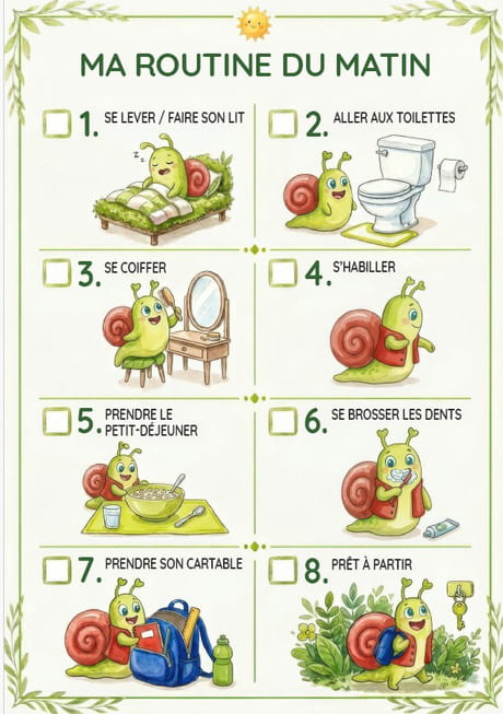 En suivant les huit étapes dans l'ordre, l'enfant apprend à se repérer dans le temps, à comprendre la notion de séquence et à organiser ses actions les unes après les autres. Les petites cases à cocher à côté de chaque étape lui permettent de suivre lui-même sa progression et de ressentir la fierté d'avoir tout accompli seul : un vrai boost pour la confiance en soi ! Pour les parents, c'est aussi un allié du quotidien : plus besoin de répéter dix fois la même chose, l'affiche s'en charge avec douceur. Imprimez-la, plastifiez-la et accrochez-la à hauteur d'enfant dans sa chambre ou dans la salle de bain. Votre petit escargot du matin se transformera vite en fusée !