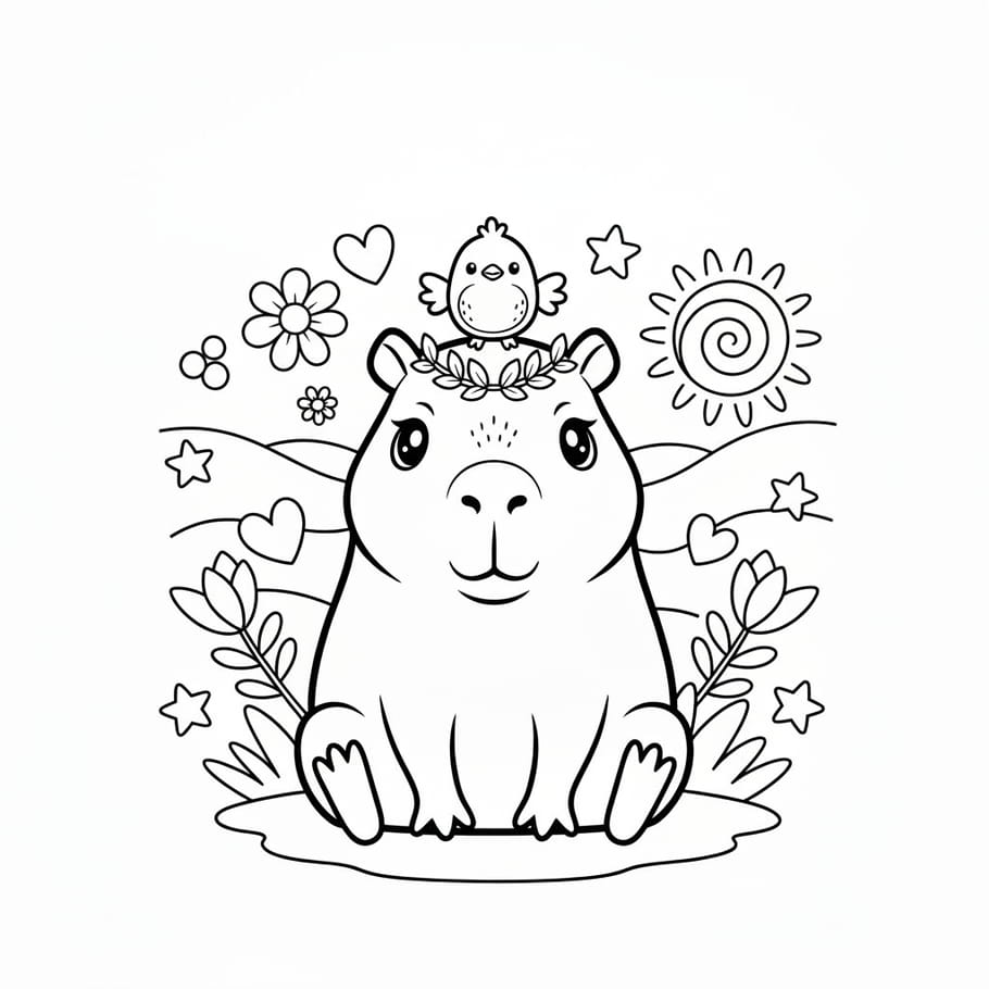 Coloriage d'un capybara Kawaï avec un oiseau sur la tête