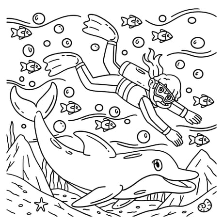 Coloriage d'une plongeuse avec un dauphin