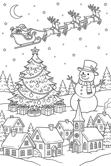 Ça y est, c'est l'heure pour le petit papa Noël d'entamer sa tournée des cadeaux. Sous la nuit étoilée du 24 décembre, le bonhomme à la barbe blanche passe en traîneau au-dessus d'un superbe village enneigé.