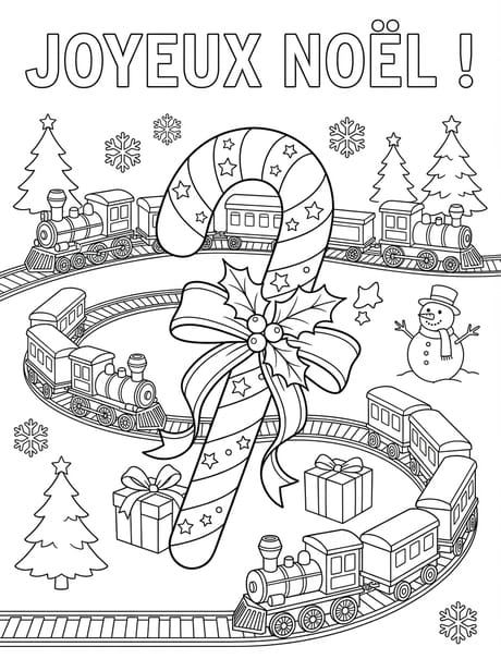 Ce sucre d'orge géant trône au milieu d'un petit train qui apporte des cadeaux aux enfants. Sortez vos crayons ou vos feutres pour le mettre en couleurs avant Noël.