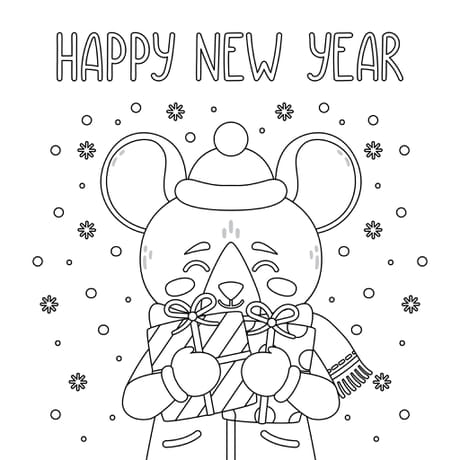 Coloriage d'une souris qui vous souhaite un "Happy New Year"