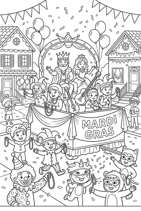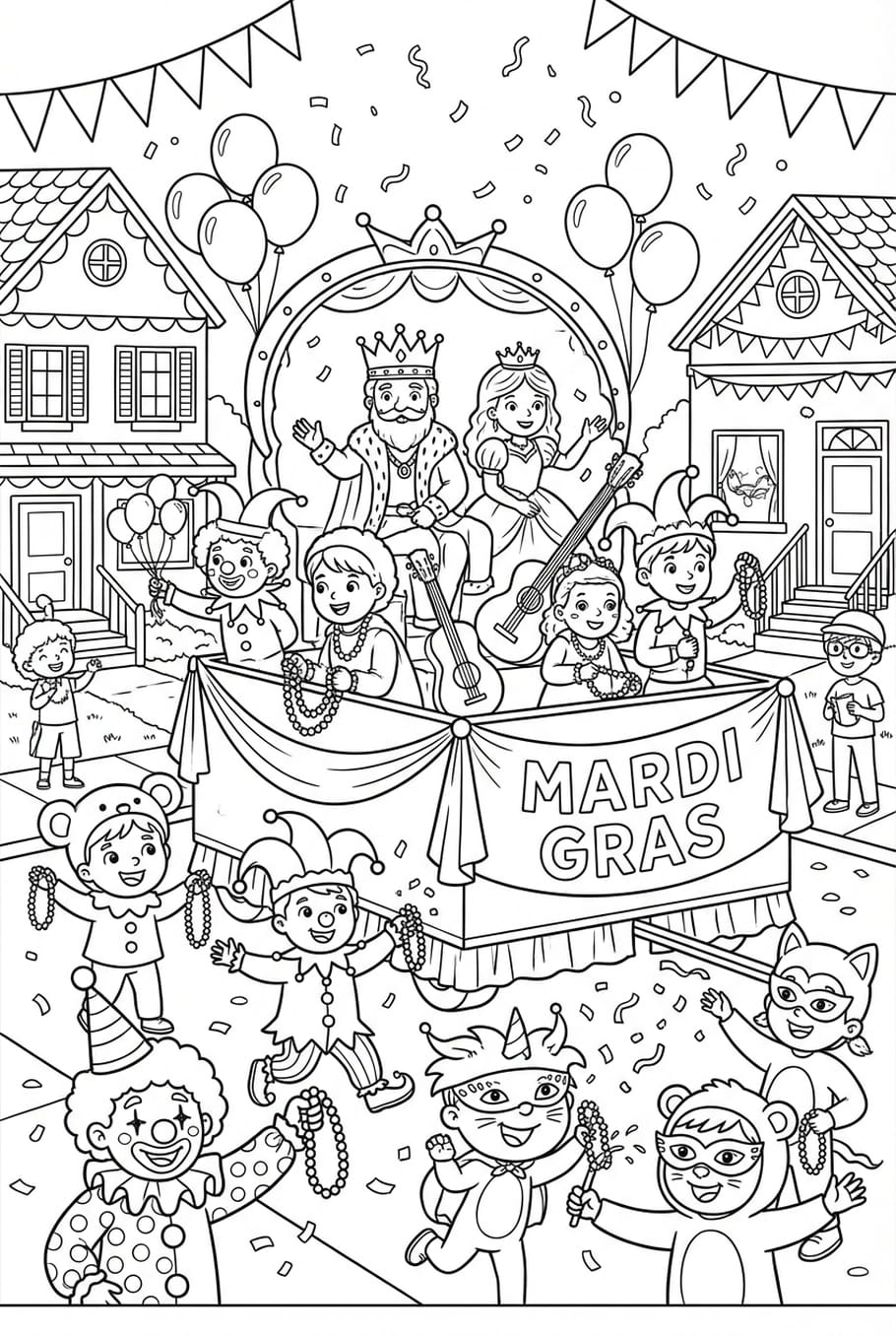 Le roi et la reine paradent sur leur joli char, pendant que les enfants dansent et chantent dans la rue avec leurs magnifiques déguisements. La seule chose qui manque ? De la couleur pour animer ce jour festif !