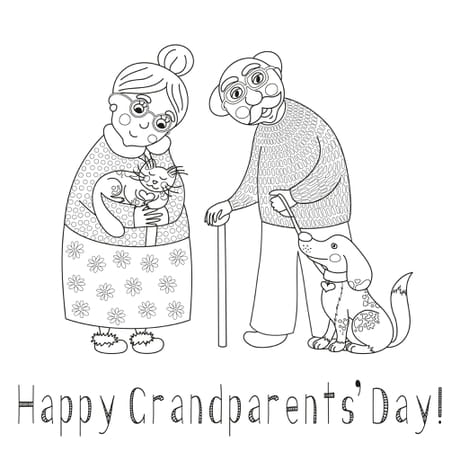 Coloriage d'une mamie et d'un papy avec leurs animaux