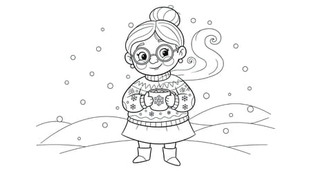 Cette adorable mamie profite d'un chocolat chaud sous la neige. Prends tes crayons de couleur et habille-la comme ta propre grand-mère !