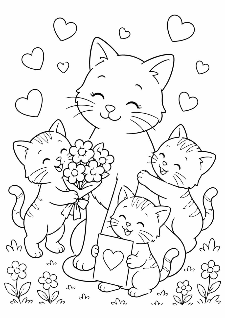 Cet adorable coloriage sera parfait à offrir pour la fête des mères, si ta maman aime les chats : elle va adorer ces petits chatons trop mignons qui font des cadeaux à leur propre maman !