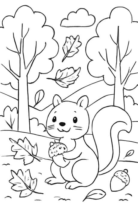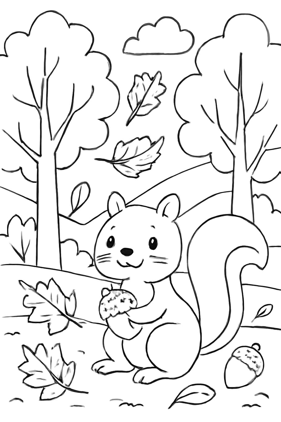 Cet adorable écureuil tenant un gland en pleine forêt n'attend qu'à être mis en couleurs.