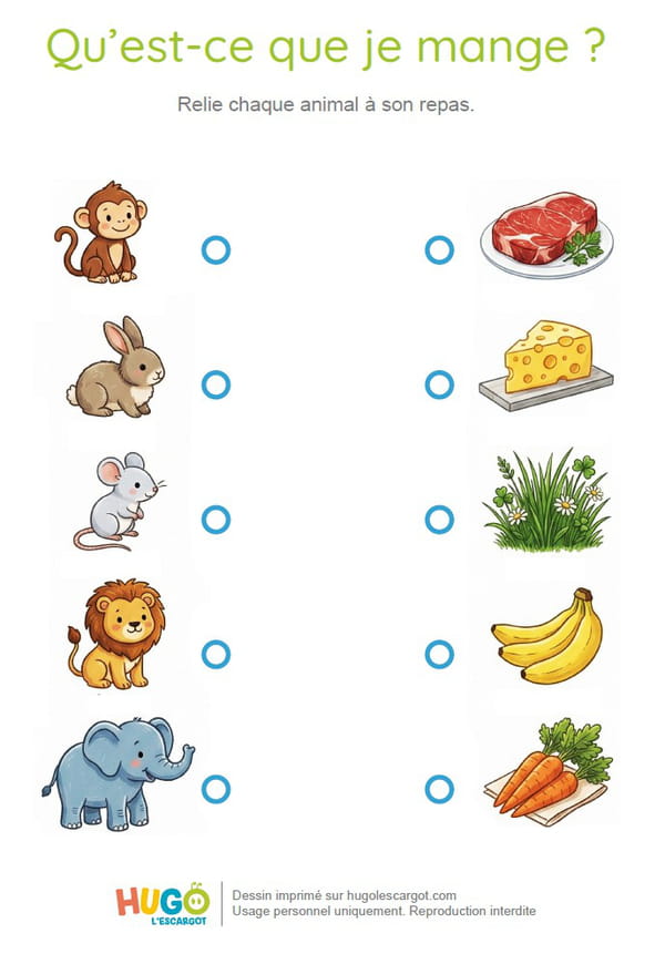 Dans cet exercice ludique et coloré, votre enfant est invité à observer attentivement cinq animaux : un singe, un lapin, une souris, un lion et un éléphant, puis à les relier à la nourriture qui leur correspond : des bananes, des carottes, du fromage, de la viande ou de l'herbe. Idéale dès la petite section de maternelle, cette activité permet aux tout-petits de développer plusieurs compétences essentielles. Elle les aide d'abord à reconnaître et nommer les animaux, tout en enrichissant leur vocabulaire autour de l'alimentation.