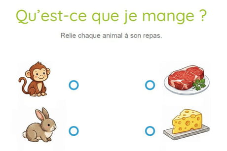 En cherchant quel aliment va avec quel animal, l'enfant exerce sa capacité de raisonnement et d'association logique. C'est aussi une belle occasion d'éveiller sa curiosité pour le monde vivant en abordant de manière simple la notion de régime alimentaire : certains animaux mangent des végétaux, d'autres de la viande. Enfin, le geste de tracer un trait entre deux points sollicite sa motricité fine et sa coordination œil-main, des compétences précieuses pour la future écriture. Un exercice tout simple, mais riche en apprentissages !