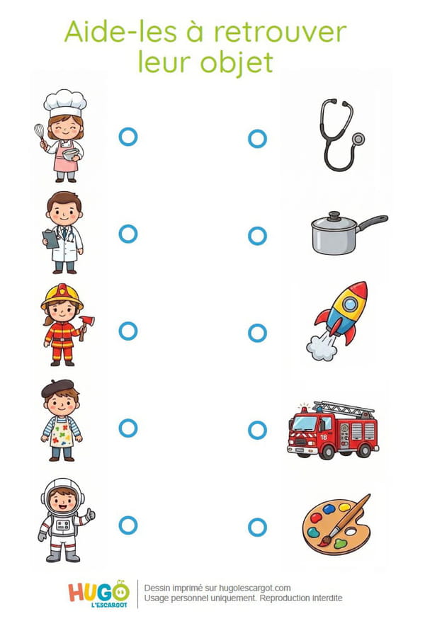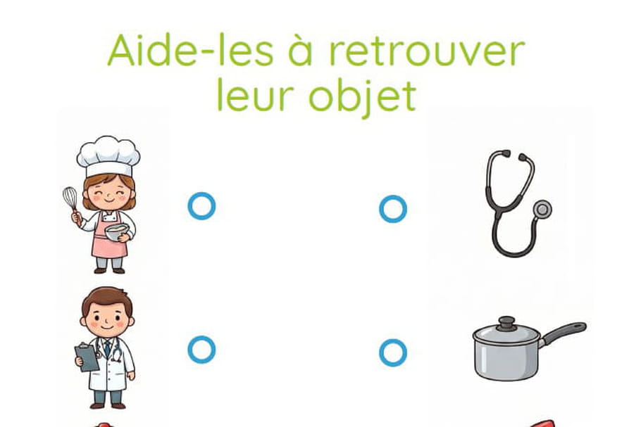 Dans cette fiche d'activité haute en couleurs, votre enfant doit aider cinq personnages à retrouver l'objet indispensable à leur métier : une cuisinière et sa casserole, un médecin et son stéthoscope, un pompier et son camion, un artiste peintre et sa palette, un astronaute et sa fusée. Pensé pour les enfants dès la maternelle, cet exercice d'association est une excellente façon de découvrir les métiers et d'éveiller la curiosité des tout-petits sur le monde qui les entoure. En observant les tenues, les accessoires et les objets illustrés, l'enfant apprend à identifier les caractéristiques propres à chaque profession et enrichit son vocabulaire au fil des échanges avec l'adulte.